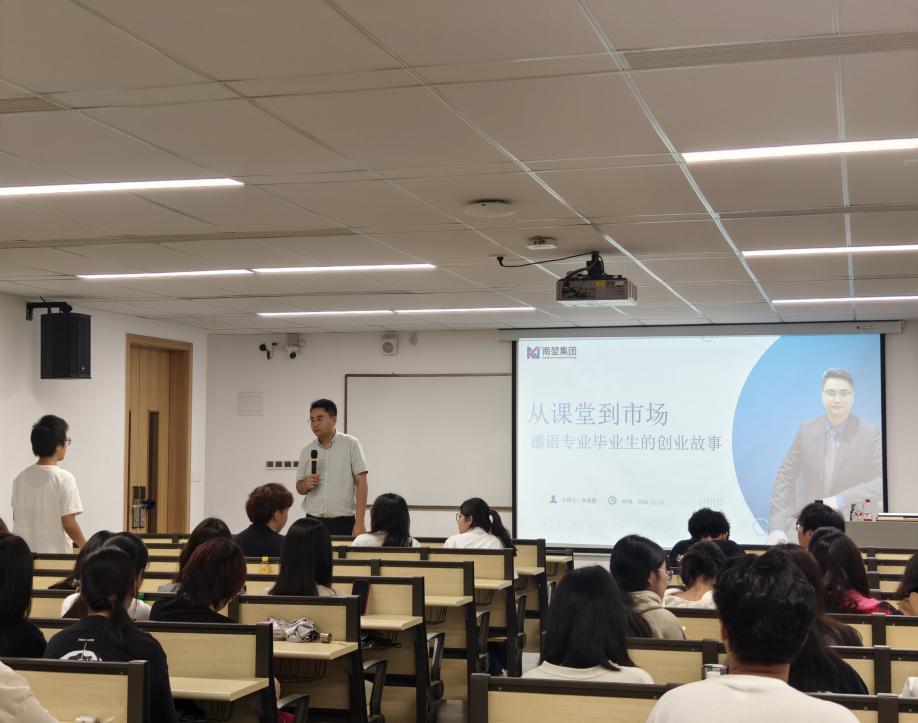 为进一步拓宽学生的职业视野,增强德语专业学生对未来职业规划的认识,帮助其更好了解德语专业的职业发展方向,我院德语专业于11月13日下午邀请了校企合作单位南堃集团创始人、德语专业优秀校友李嘉聪进行创业故事分享。讲座由精品人妻无码德语专业教师周婷主持,24级德语专业学生参与了本次活动。