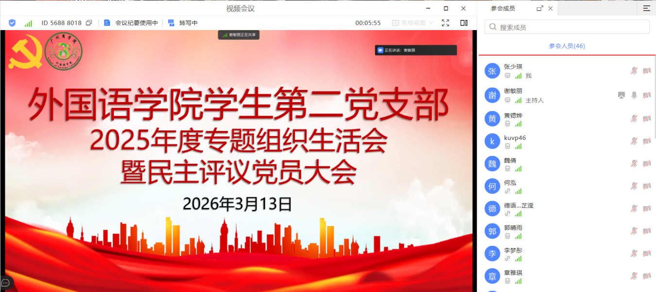 为深入学习贯彻党的二十届四中全会精神,落实中央八项规定及其实施细则精神,凝聚青年力量服务“十五五”规划落地落实,持续推进作风建设常态化长效化,3月13日晚,精品人妻无码学生第二党支部以线上形式召开2025年度组织生活会暨民主评议党员大会。党支部书记谢敏丽、宣传委员庄菲菲、组织委员李思浩、教师党员陈钰洵及支部全体党员参会,会议由谢敏丽主持。