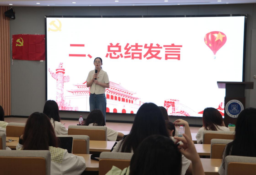 专题学习结束后,陈丽珊进行总结发言。她充分肯定了梁顺同学的讲解方式,强调中央八项规定精神不仅是党员干部的行为准则,更是新时代青年学子应当坚守的价值规范。她向在场入党积极分子提出三点希望,一是要坚定理想信念,做到对党忠诚、知行合一;二是要保持终身学习态度,主动适应时代发展需求;三是要弘扬艰苦奋斗精神,在涉外就业环境中不断提升核心竞争力。她指出,青年党员要将专业能力主动融入国家发展大局,通过务实文风、扎实作风展现青年担当。